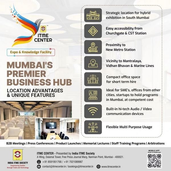 ITME Center, presented by India ITME Society, is Mumbai's premier 3890 sq mtr Hybrid Technology-based Conference and Expo venue. The center is equipped with the latest equipment, modern technology, and communication devices, providing a world-class experience for events. Its vision is to create a micro exhibition facility offering both virtual and physical platforms year-round at competitive prices in South Mumbai, while its mission is to foster a culture of achievement, passion, excellence, and longevity for SMEs, MSMEs, and various industry events at affordable costs.