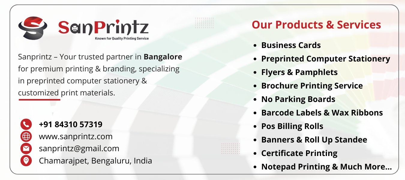 SanPrintz has been a leading provider of premium printing services across Karnataka for nearly two decades. Established in 2005, we specialize in delivering high-quality, customized printing solutions that cater to businesses, educational institutions, retail, hospitality, healthcare, and event management industries. Our commitment to innovation, precision, and reliability has made us a trusted name in the printing industry. Whether you require visiting cards, brochures, bill books, posters, or specialized printing solutions like barcode labels and prescription pads, SanPrintz guarantees superior results tailored to your needs.