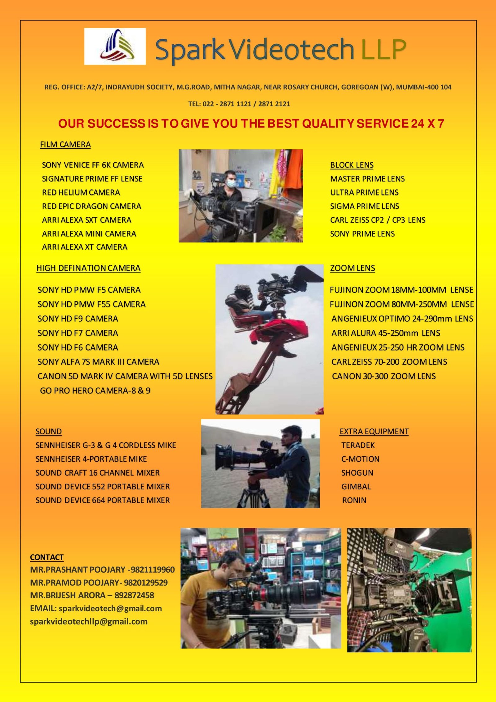 Spark Videotech LLP is one of the leading businesses. In the Cameras, Lenses, Sound Equipment for Indoor & Outdoor Shootings On Hire. Also known for Cameras On Hire, Film Equipment’s On Hire, Video Cameras On Hire and much more.